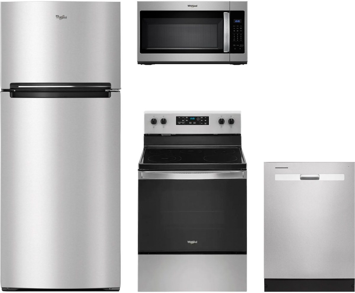 Whirlpool® 4 Piece Stainless Steel Kitchen Package with a built in dishwasher, over the range microwave, free standing electric range, and a top mount refrigerator.Read More
